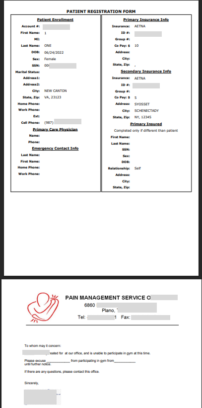 - When the Patient Info toggle is ON, the Patient Complete information will be sent as a fax, and it will be shown as below:
