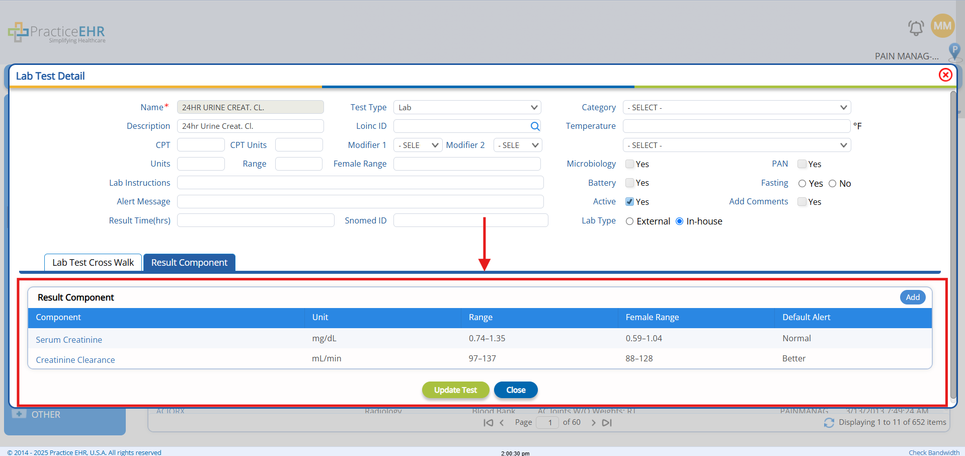 - Update the Lab Result Component values by clicking the Update button, and the Results will be updated and saved.