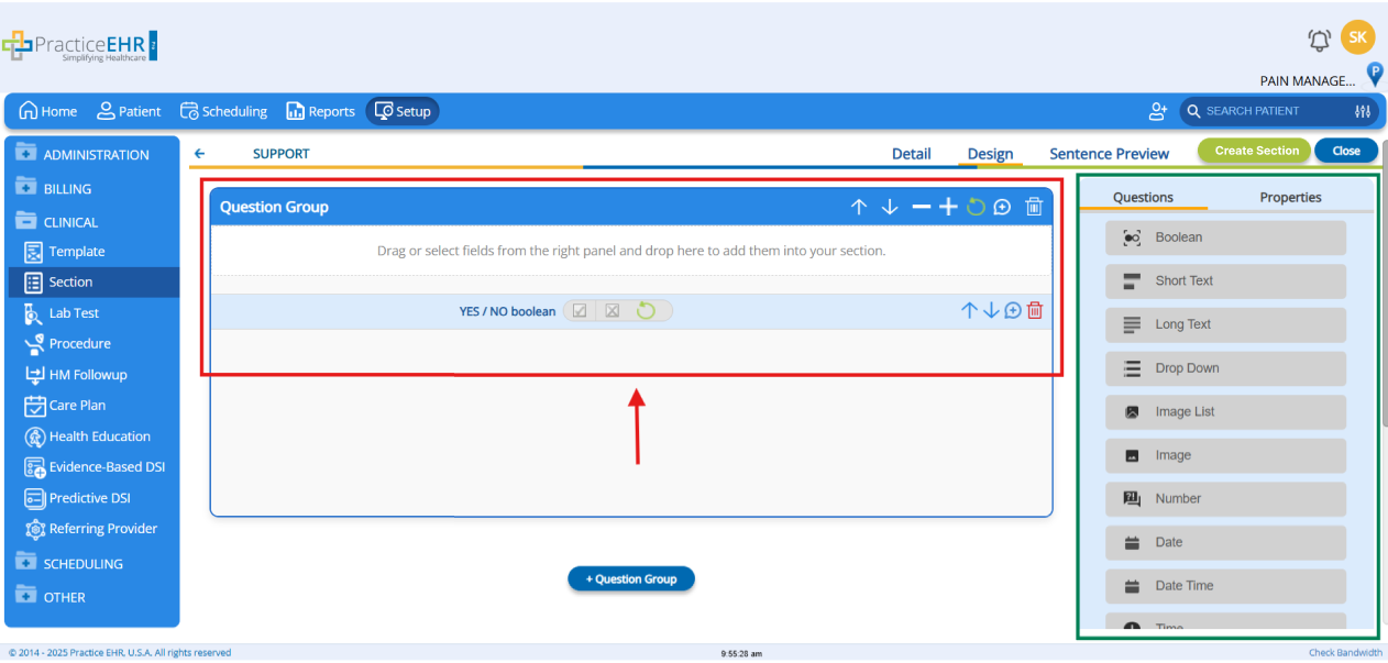 - In the Design Tab, the user will add the Chief Complaint or Question Group/ Questions depending on the section type, as shown below.